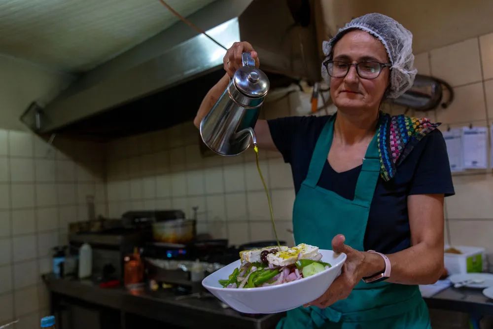 ↑在希臘伯羅奔尼撒半島麥西尼亞,一名女子往沙拉上倒橄欖油。